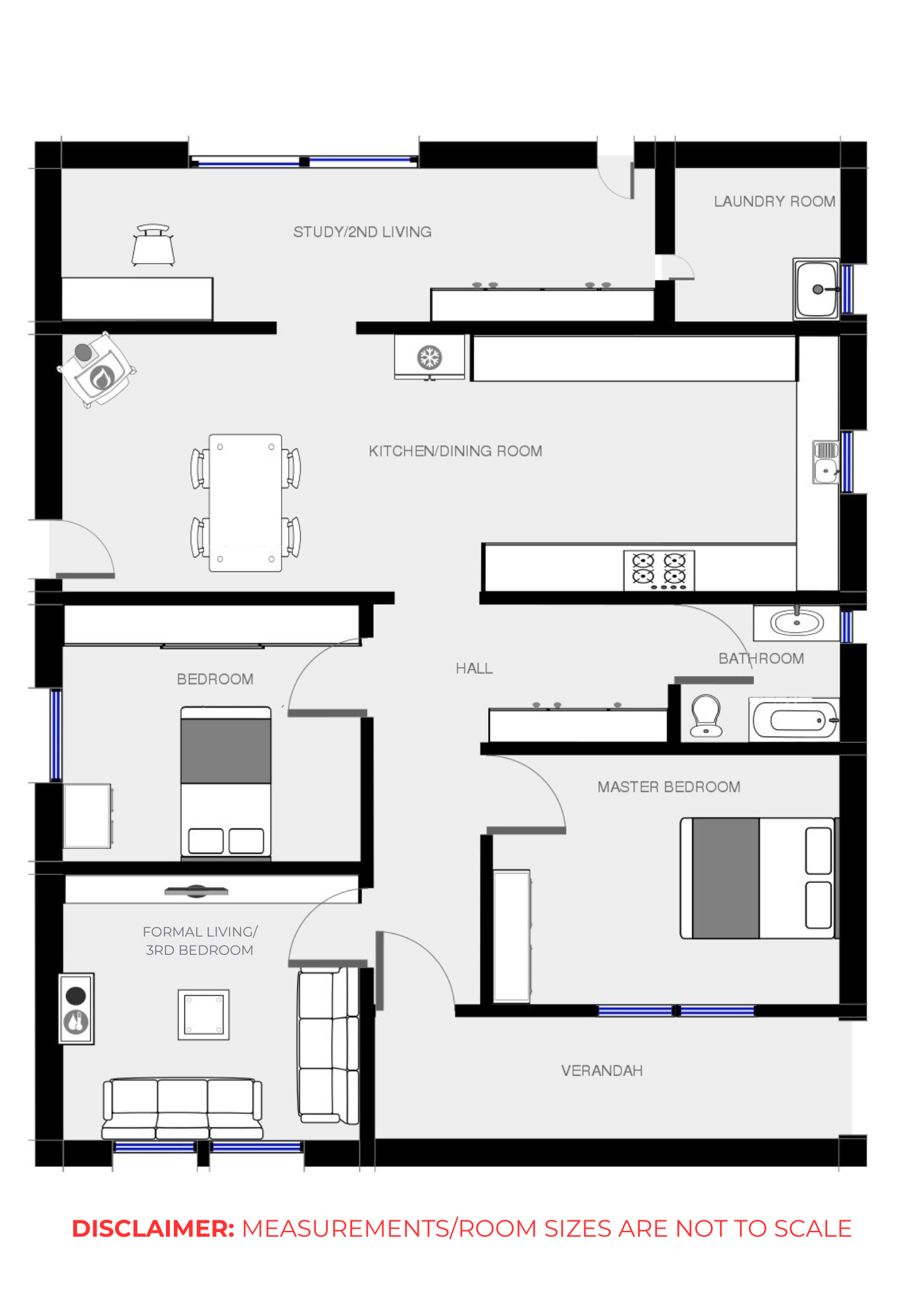 • Large entrance hall branching to 2 double bedrooms and formal living/3rd bedroom.