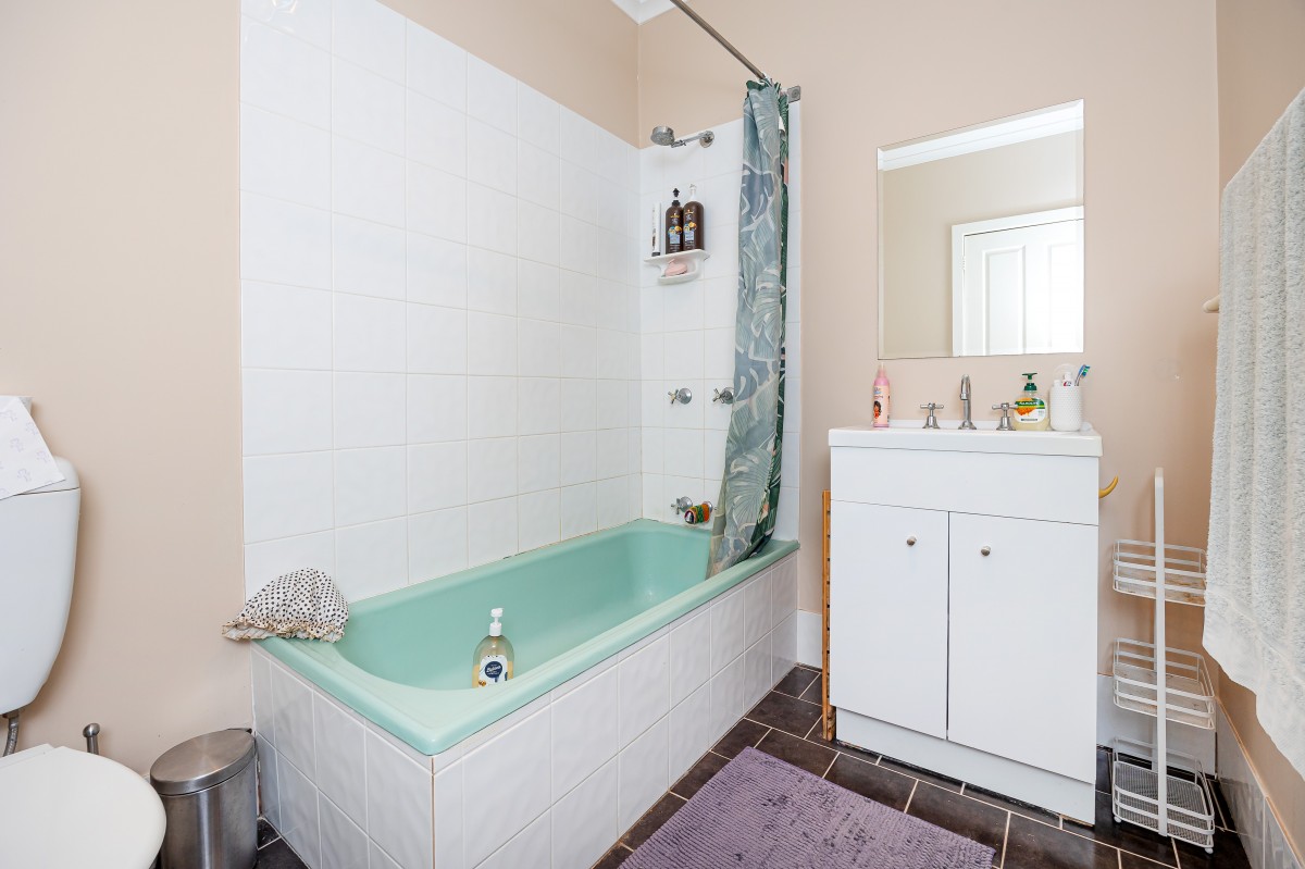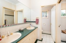 • 2 bathrooms, one at either end of the home. Front bathroom is semi-updated and includes bath/shower combination, tiled floor. Rear bathroom is a 3-way design, with double vanity, separate toilet, bath and separate shower recess.