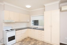 The open-plan living, dining, and kitchen area offers a comfortable and functional layout. The kitchen is neat and relatively modern, equipped with a pantry and upright electric stove. Climate comfort is ensured with a reverse-cycle split system and ducted evaporative air conditioning.
