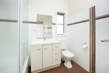 The tidy, tiled bathroom includes a shower, toilet, and vanity, while the laundry provides external access and is fitted with built-in storage cupboards.