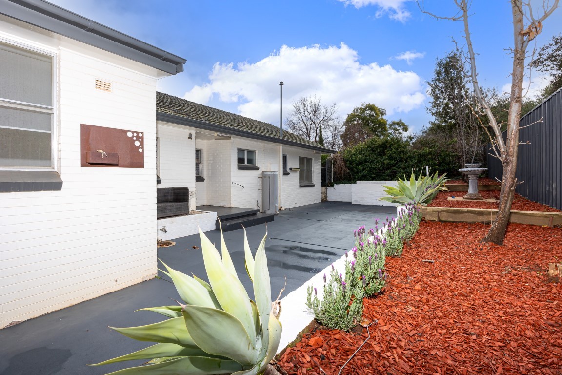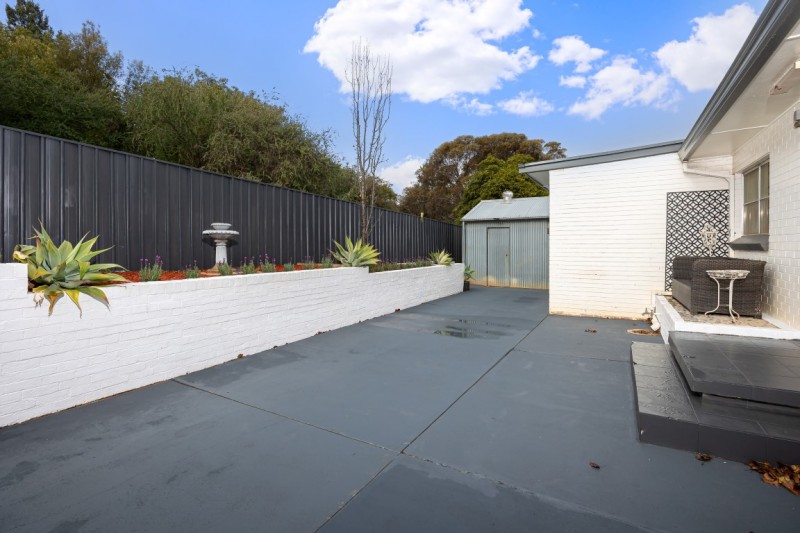 A single lock-up garage with power and a concrete floor provides secure parking. Outside, the property features an established, low-maintenance garden with mature trees, pop-up irrigation in select areas, and a private rear courtyard with tiered landscaping-ideal for family gatherings or relaxed entertaining.