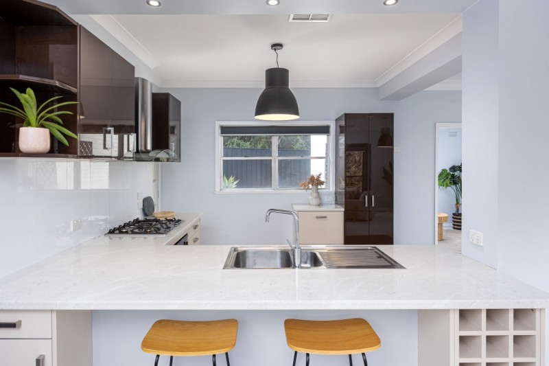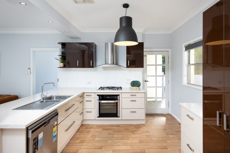 The well-appointed kitchen is equipped with stainless steel appliances including a brand-new dishwasher, oven, gas cooktop, pantry, and breakfast bar, flowing seamlessly into the adjacent dining area.