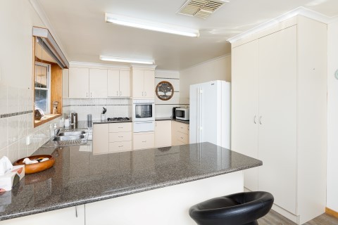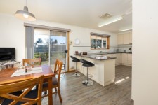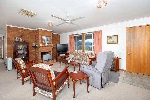 Step inside to find a large living area featuring a cozy brick fireplace and LPG gas bayonet - perfect for year-round comfort. The open-plan kitchen and dining area is enhanced by durable vinyl plank flooring and full-length built-in storage. North-facing glass sliding doors provide natural light and easy access to the rear veranda, ideal for entertaining or relaxing outdoors.