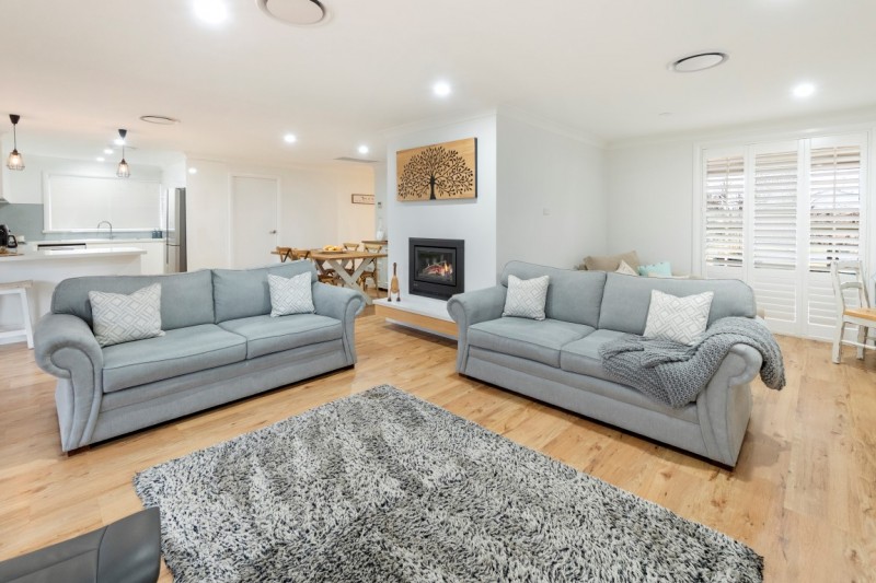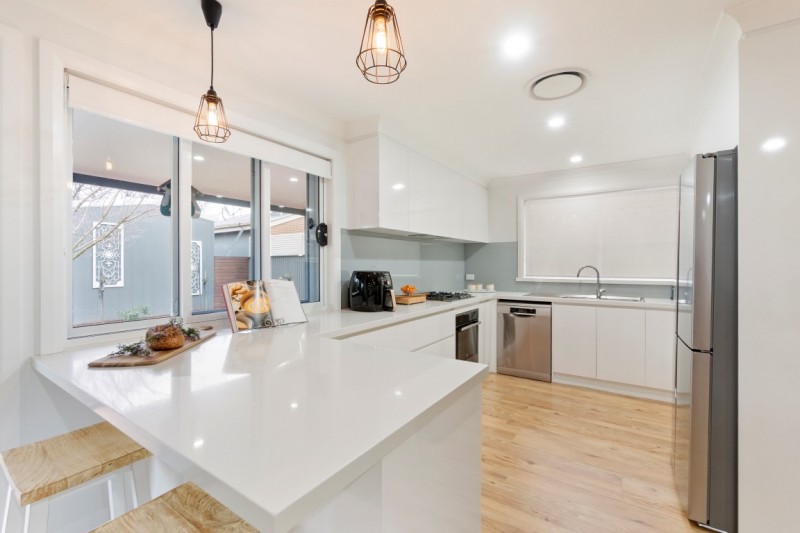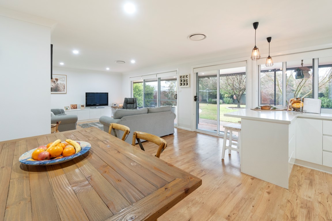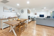 At the heart of the home lies a stunning, renewed kitchen boasting soft-close cabinetry, a pantry with drawers, servery window, electric oven, gas cooktop, and dishwasher. The expansive open-plan living, dining, and kitchen zone also includes a handy study nook and flows effortlessly to the outdoors via large glass sliding doors, offering full-length views of the backyard.