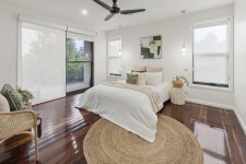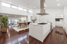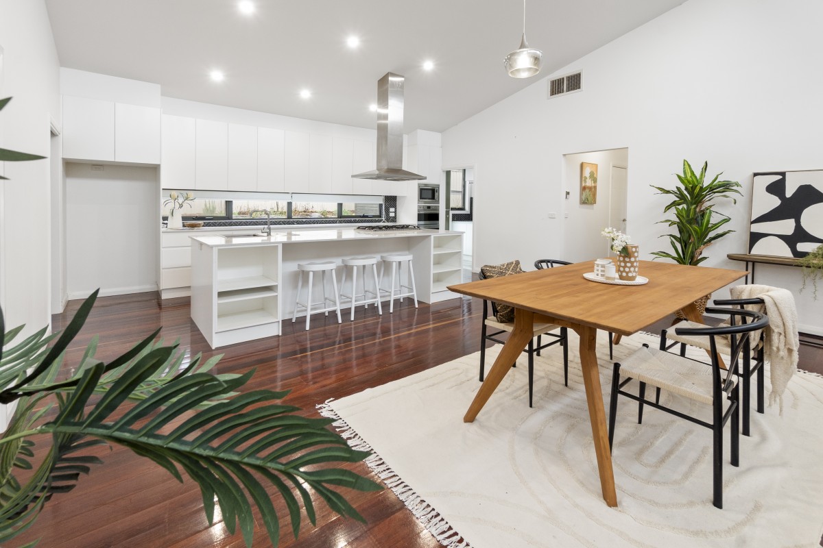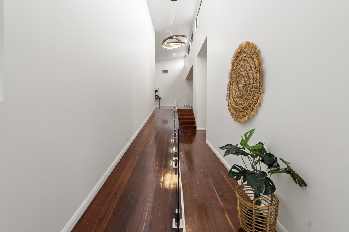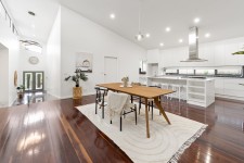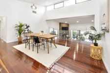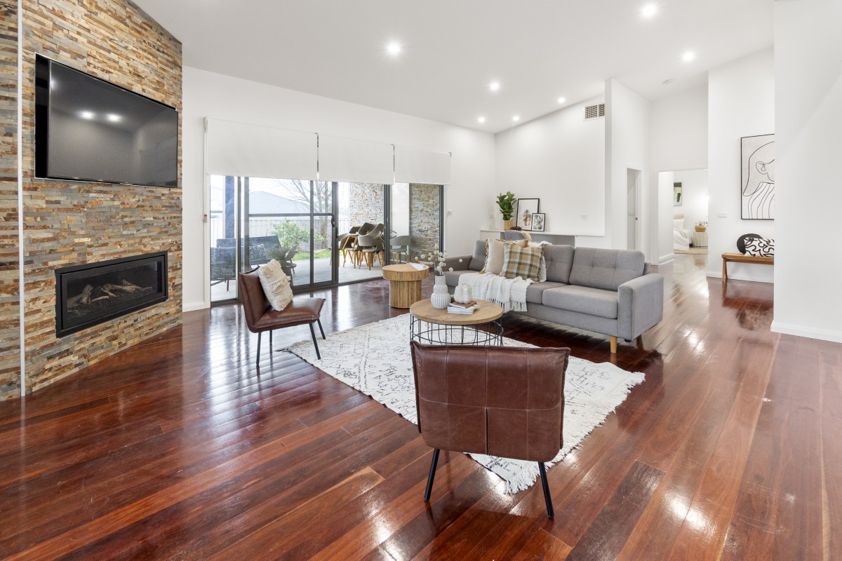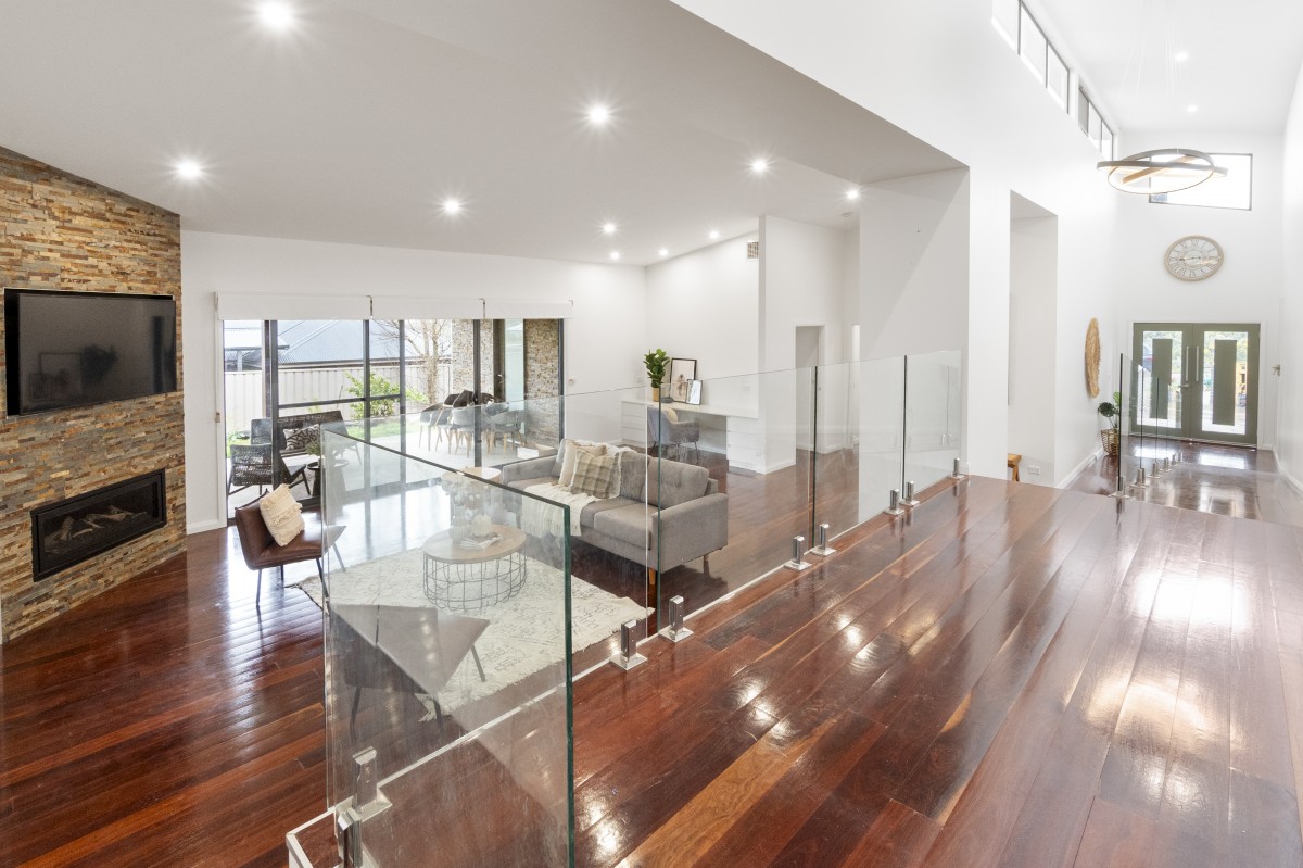 The home showcases stunning floating Redgum timber floors that flow seamlessly through the expansive floor plan. A welcoming entryway leads you into either the sprawling kitchen and dining area or the inviting living space, enhanced by a feature gas fireplace and a dedicated study nook.