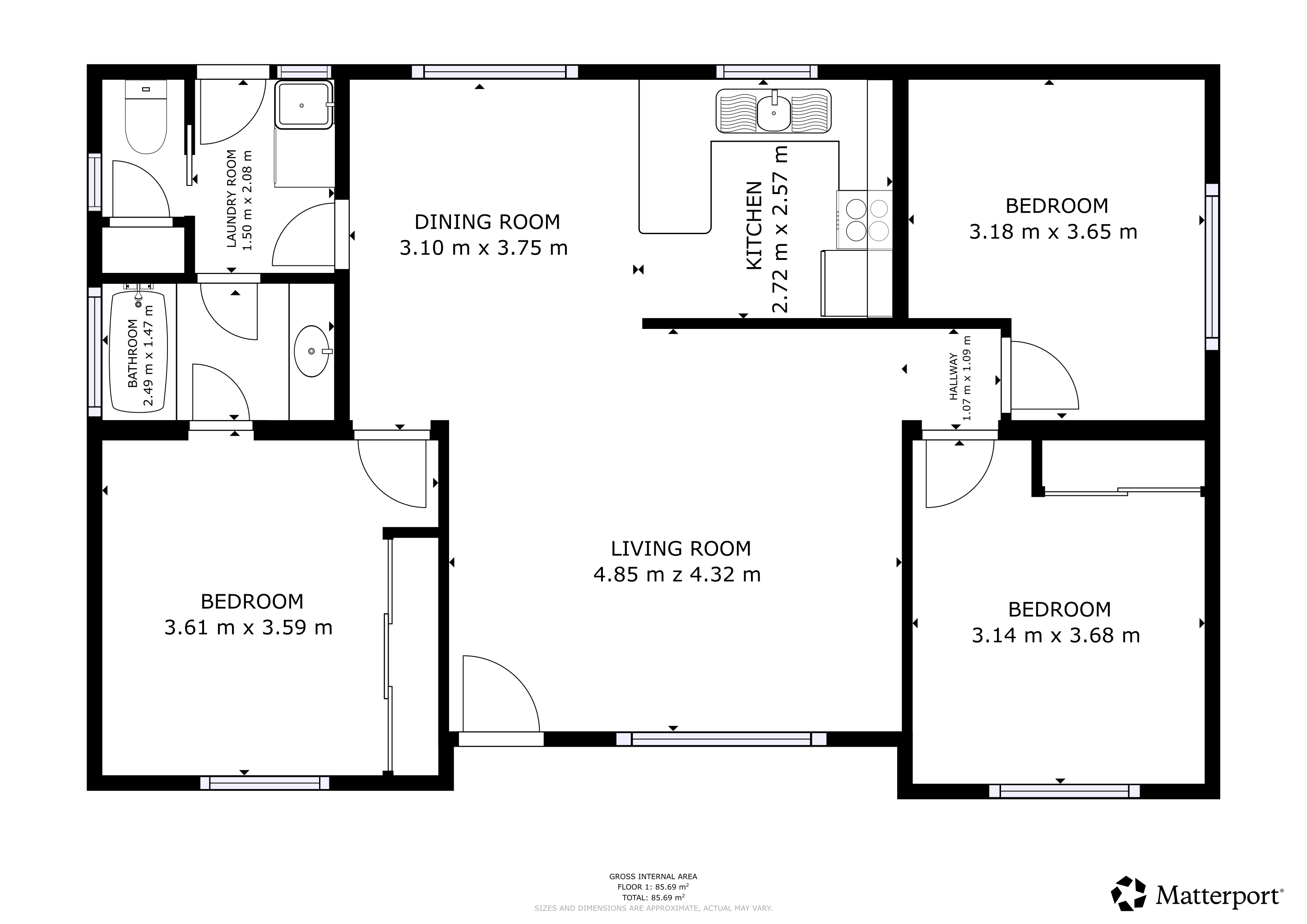 Inside, the home features three bedrooms, two with built-in wardrobes. The functional kitchen includes a breakfast bar and freestanding oven, flowing into a dedicated dining space. The front living room offers a cosy atmosphere with a ceiling fan for added comfort.