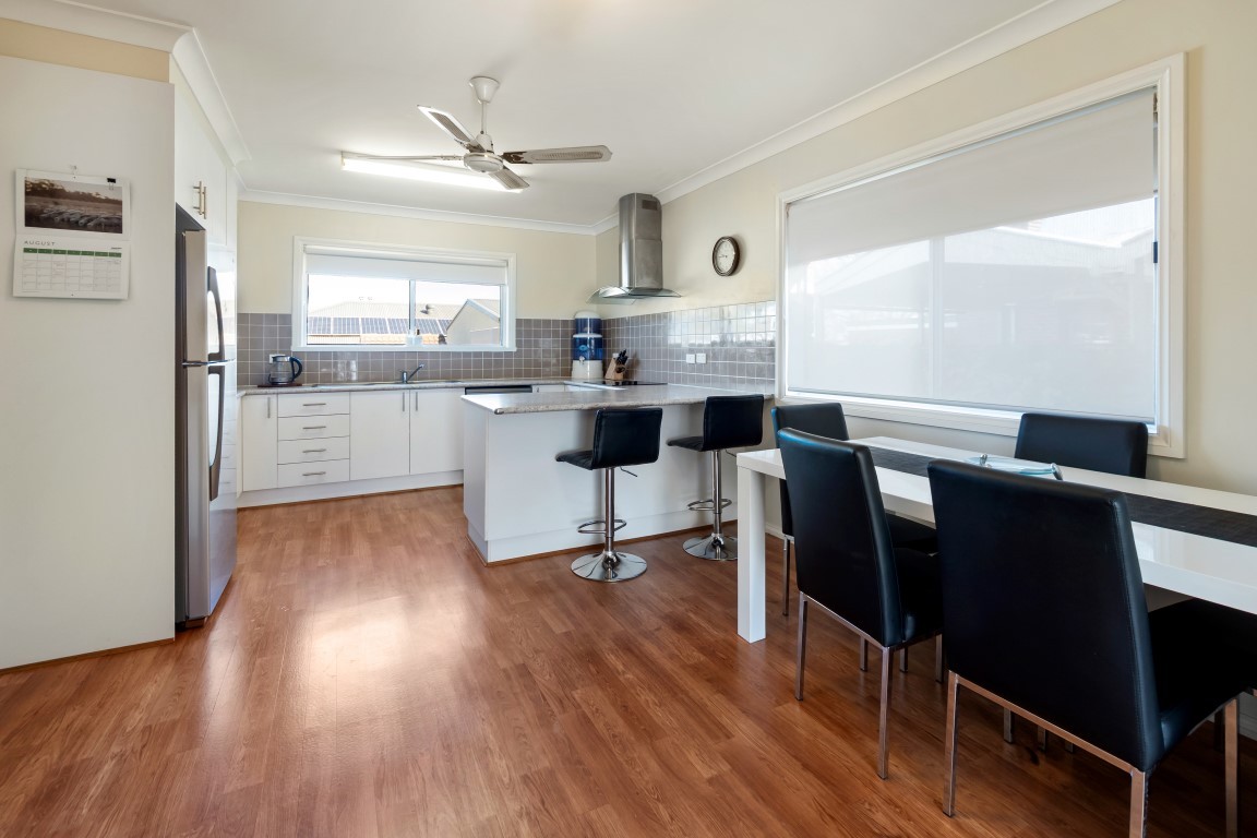 This property has a sunny, east facing living area that flows into a spacious kitchen and dining zone, featuring easy-care vinyl flooring. The revamped kitchen includes an electric oven, dishwasher, breakfast bar and a large pantry.