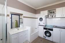 • Combined bathroom and laundry featuring built-in shelving, wash tub, vanity, bathtub, shower and separate toilet
