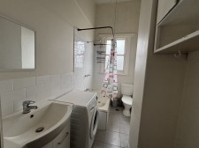 The bathroom includes a vanity, washing machine, toilet, and a shower over the bath.
