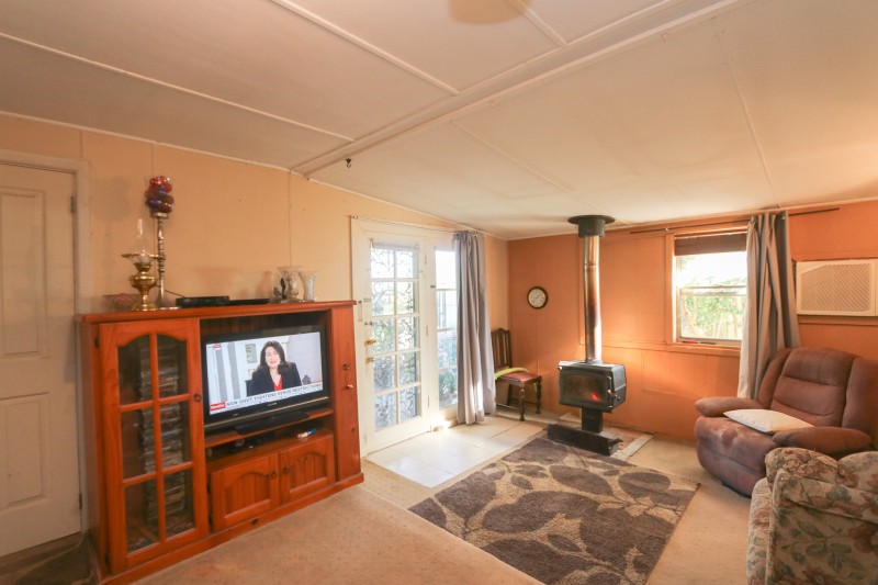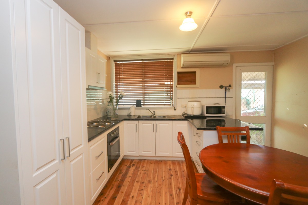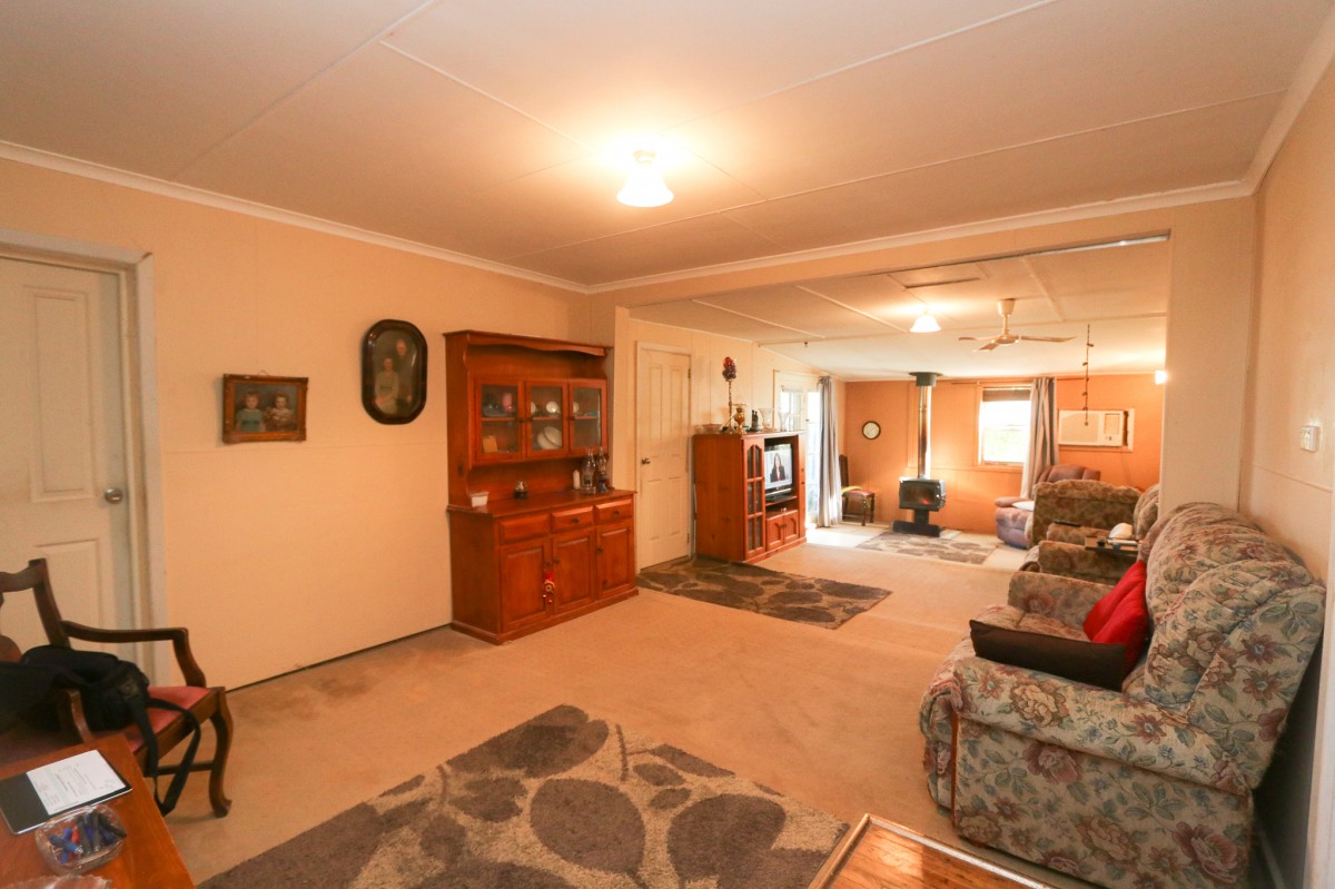 Neat and tidy front verandah. This home is comprising three bedrooms, one with built-in-cupboards and a ceiling fan. Combined modern kitchen and dining, and a large walk-in pantry. Kitchen features electric oven, electric cooktop, and a reverse cycle unit. Great size central living area has a reverse cycle unit and a freestanding wood fire heater. Carpet throughout and floorboards in the kitchen. Tiled bathroom consisting of toilet, vanity, and shower. Second toilet in the oversize laundry with ample storage.