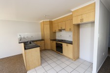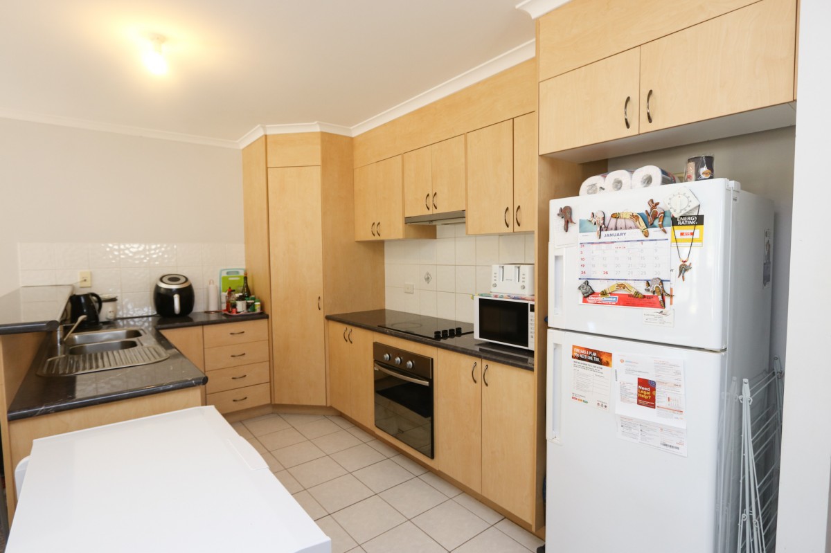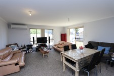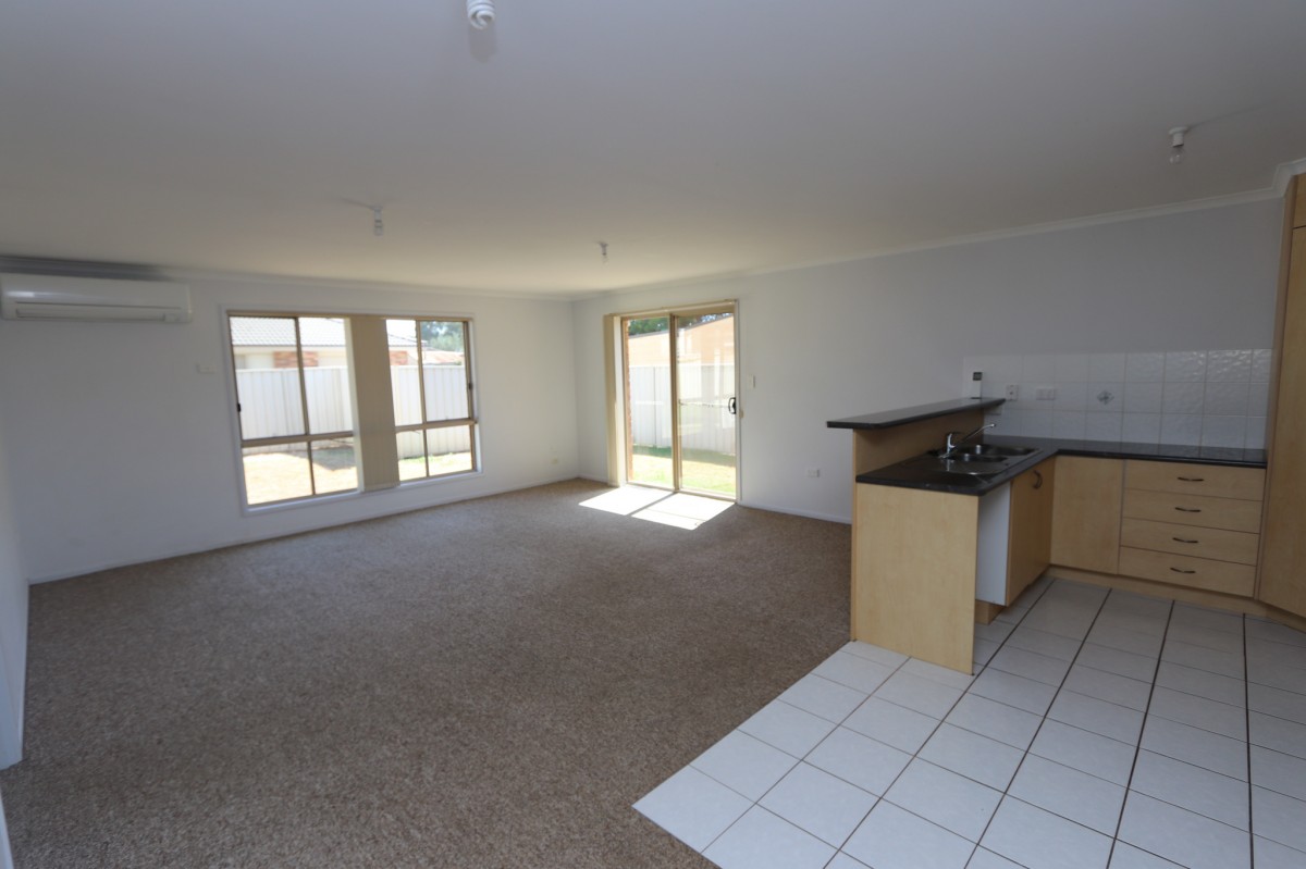 -Modern kitchen with electric oven and cooktop, open plan dining and living area with split system for year round comfort.