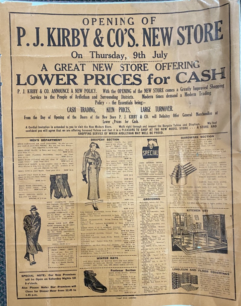 Patrick Kirby cash store Established in 1909 unfortunately destroyed by fire in 1935 to be rebuilt in Ardlethan's main street in 1936 currently running as a Pharmacy and a Giftshop.