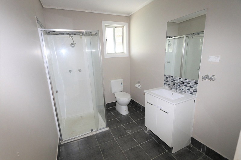 - Bathroom features shower, toilet, vanity and washing machine outlet.