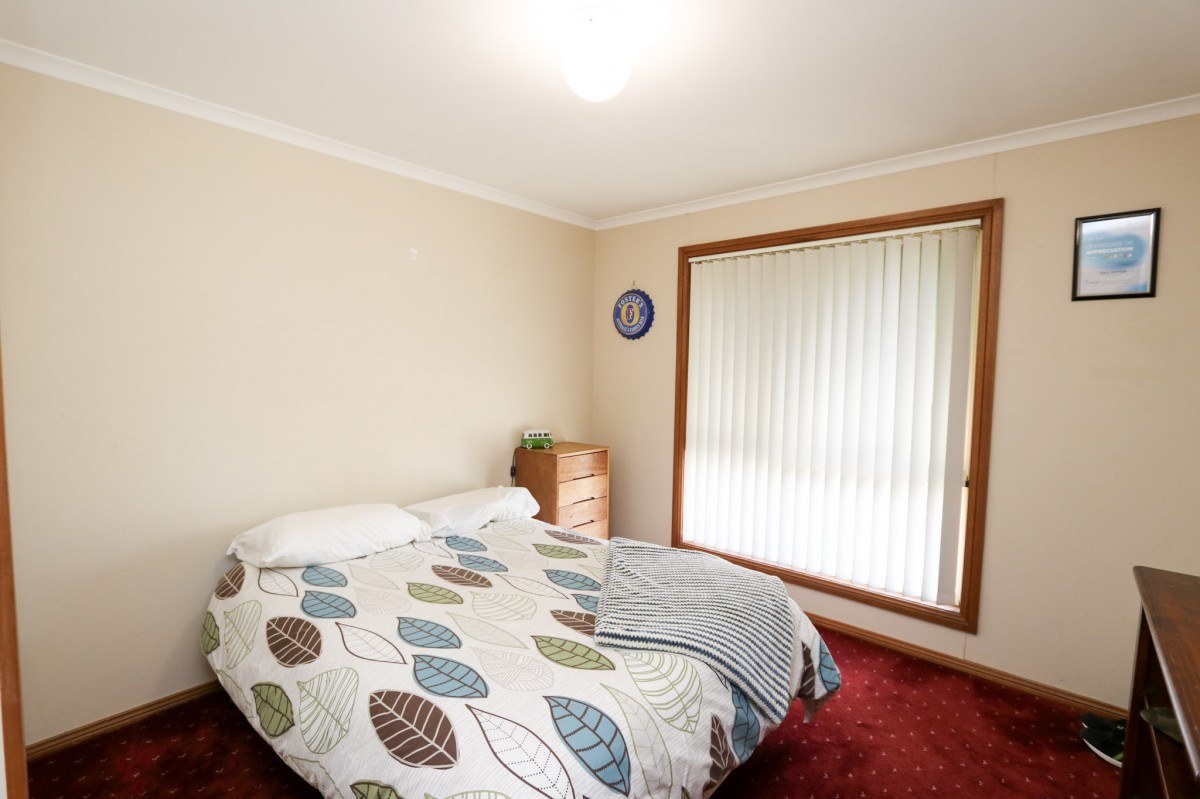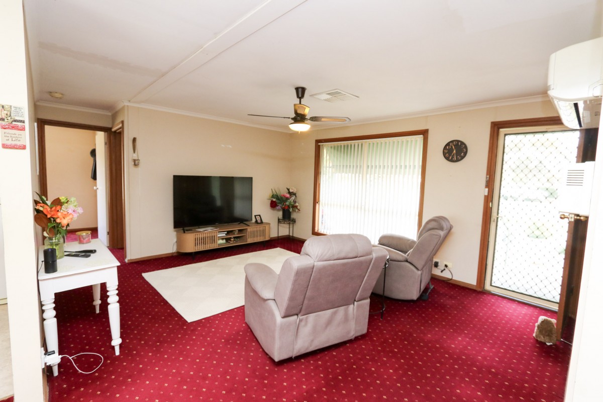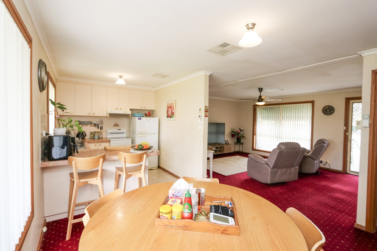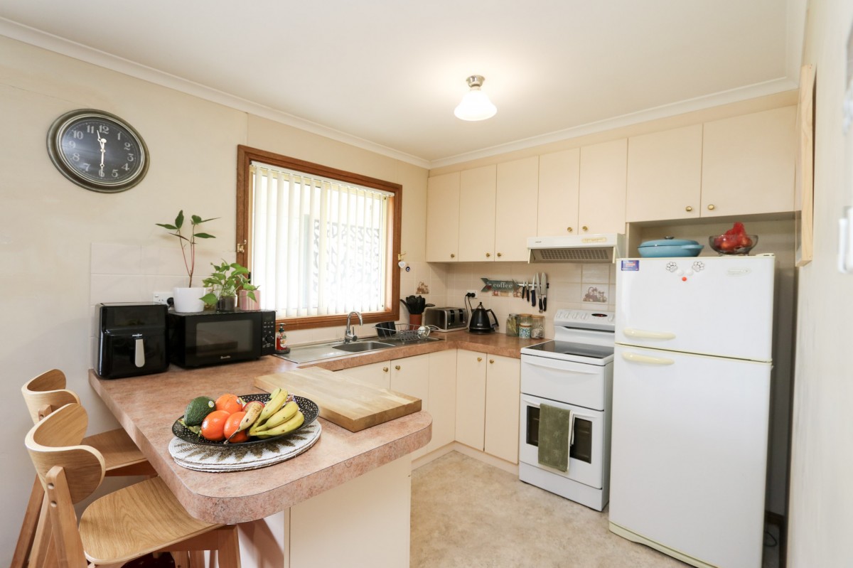 Inside, the home features three bedrooms, two with built-in wardrobes. The functional kitchen includes a breakfast bar and freestanding oven, flowing into a dedicated dining space. The front living room offers a cosy atmosphere with a ceiling fan for added comfort.
