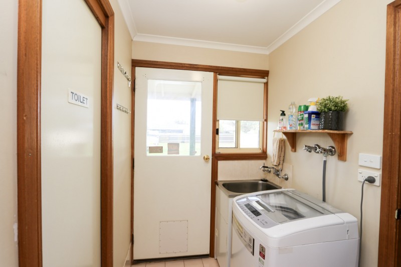 The central bathroom, accessible from both the main bedroom and laundry, includes a large vanity, shower-over-bathtub, separate toilet, and linen press. The laundry provides external access and a washtub for added practicality.