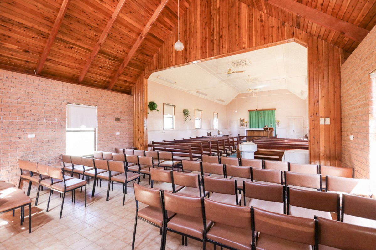 The church consists of two rooms the church itself and a small kitchenette/storage room. The original section of the church includes; original timber flooring, pressed metal ceilings and walls. The front extension to the church was completed in 1989 of brick walls, timber ceilings and tiled flooring. Additionally, there is an external single toilet.
