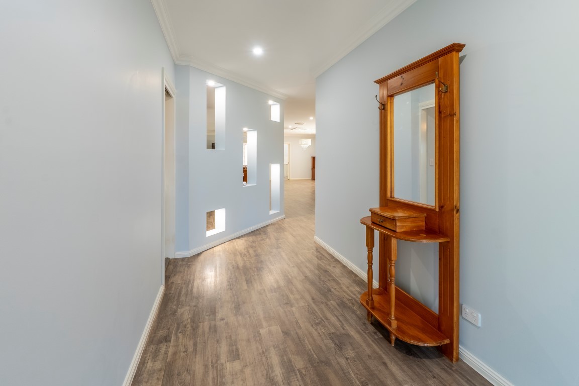 Outside, enjoy a northeast-facing veranda/patio with lights and fans, oversized double garage, Colourbond shed with concrete floor and water tank, and established gardens with vegie beds and citrus trees.