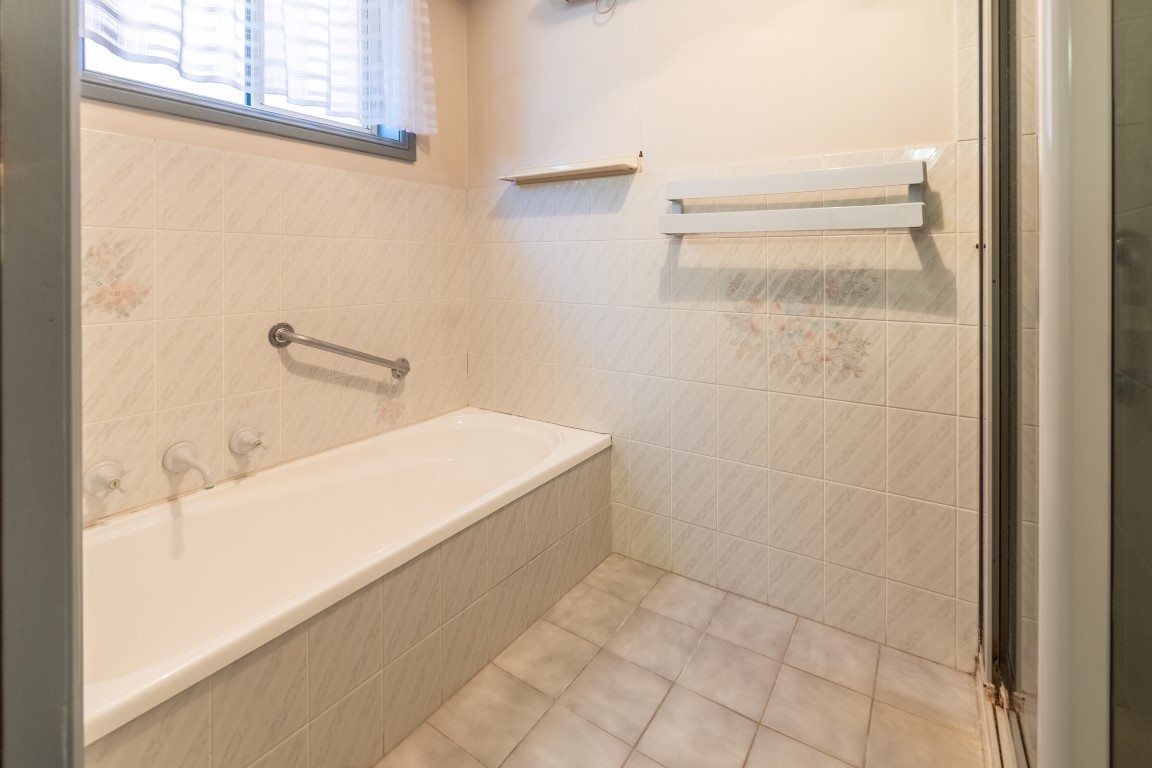 • Neat, tiled 3-way family bathroom includes a large vanity, separate toilet room, bathtub and shower recess.