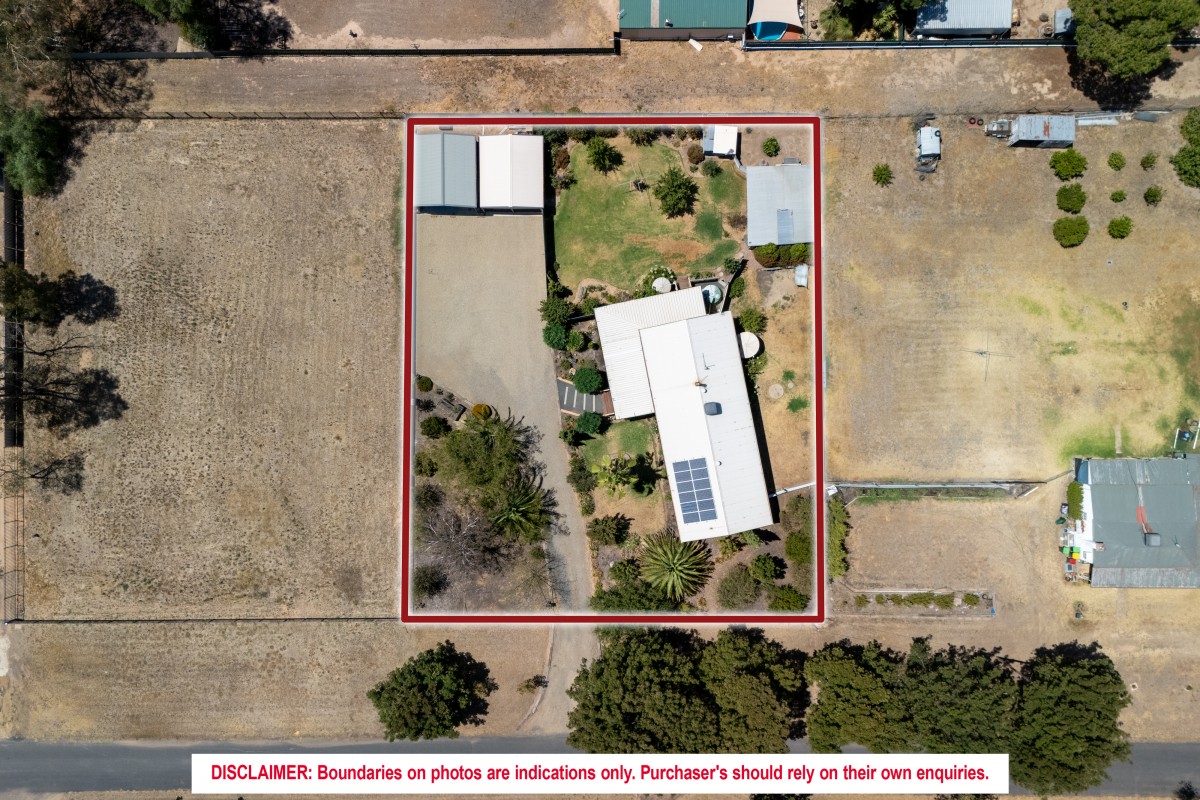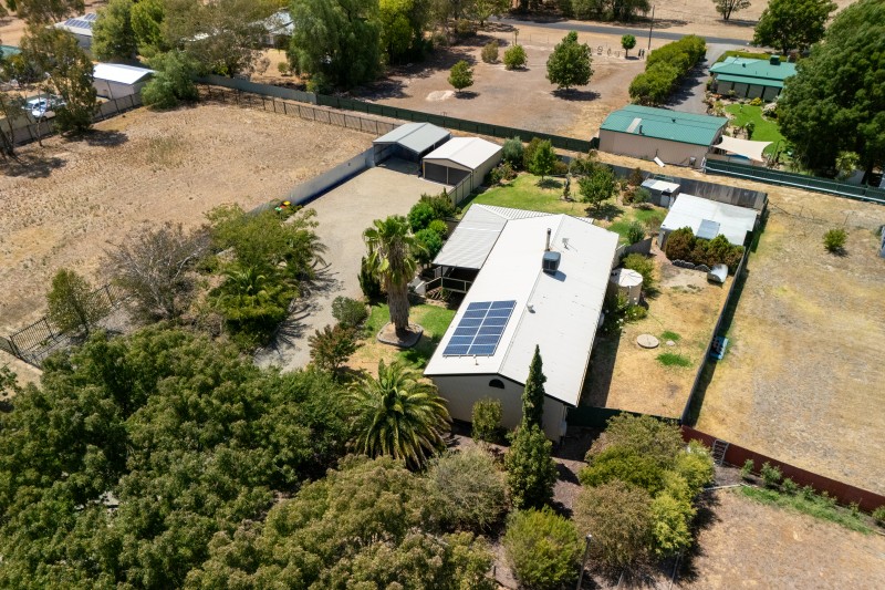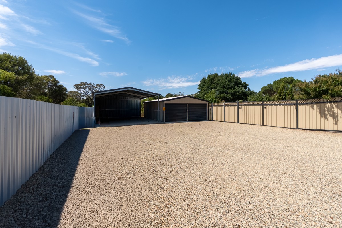 Outdoors, established trees and shrubs create a secluded, private setting. The road-base driveway leads to a 6x7m double garage with two electric roller doors and a PA door, plus an additional 6x7m extra-high skillion ideal for caravan parking. All parking areas feature concrete floors and sarking. Additional features include a garden shed, chook yard, 3.3kW (12-panel) solar system, Envirocycle septic system, and three water tanks (10,000L, 5,000L, and 1,000L).