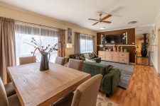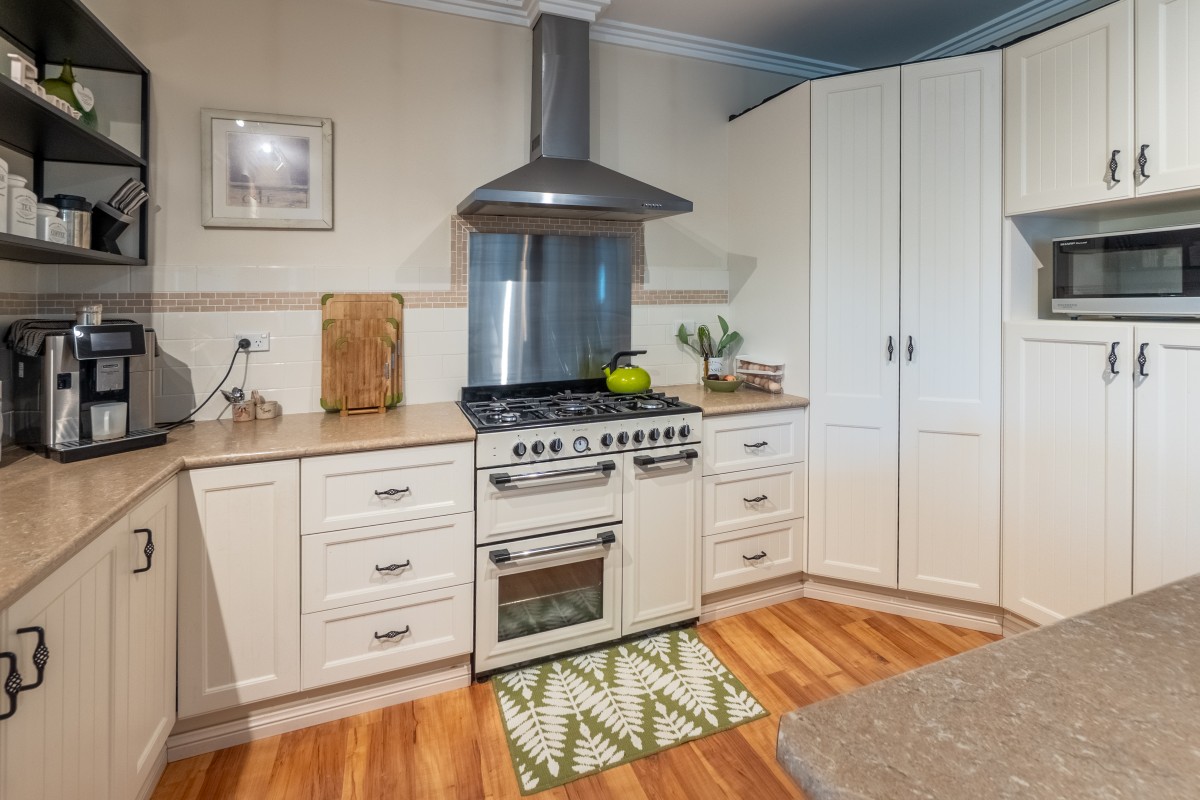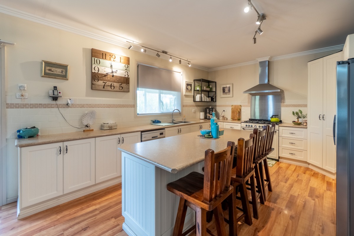 Inside, the home showcases a timeless neutral palette throughout, with consistent flooring, cabinetry, blinds, and paint tones creating a calm, cohesive feel. The open-plan kitchen, living, and dining area is warmed by a woodfire and serviced by evaporative cooling, making it ideal for relaxed country living. The kitchen is well equipped with a 5-burner gas cooktop, electric oven, dishwasher, generous island bench with breakfast bar, double fridge space, and excellent storage.