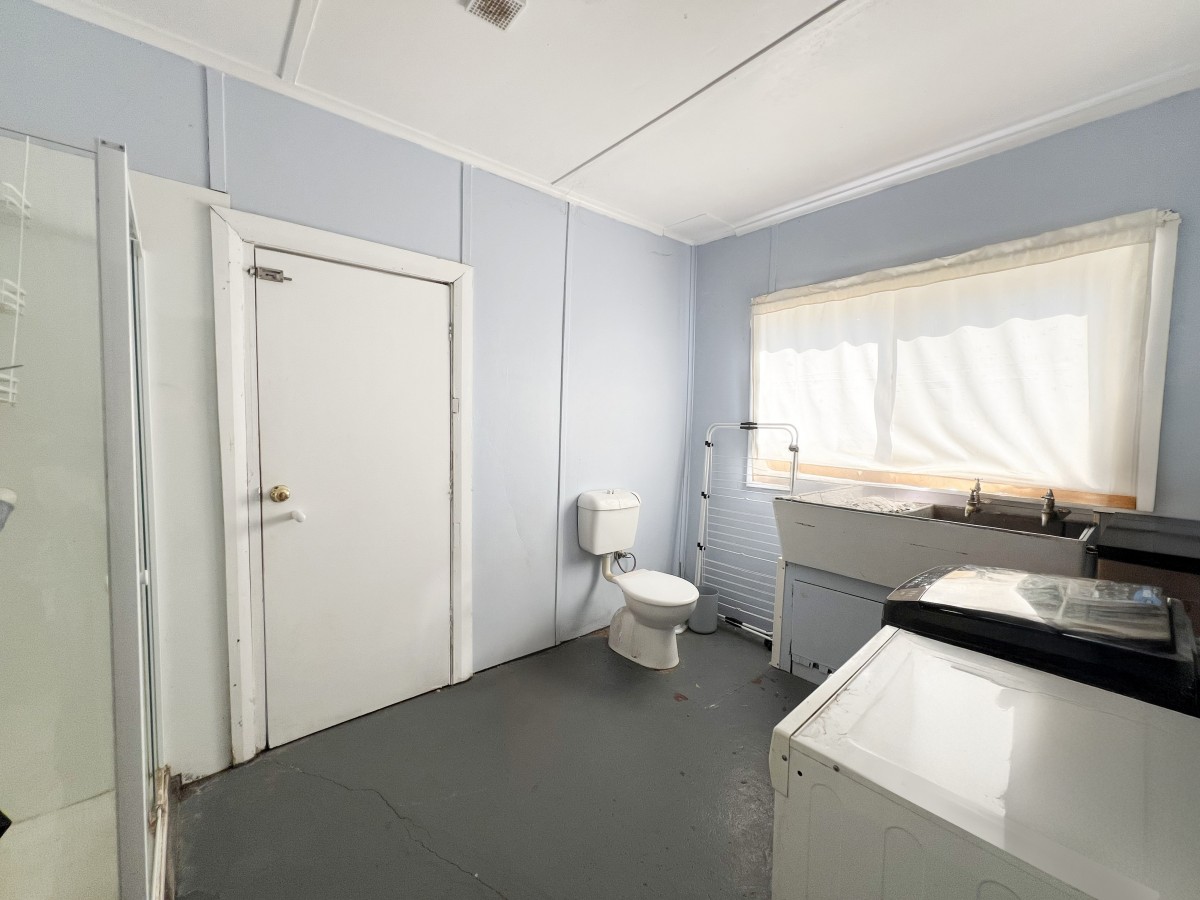 The main bathroom includes a bathtub and vanity, while the adjoining laundry offers added convenience with a single washtub, shower, toilet, and direct external access.