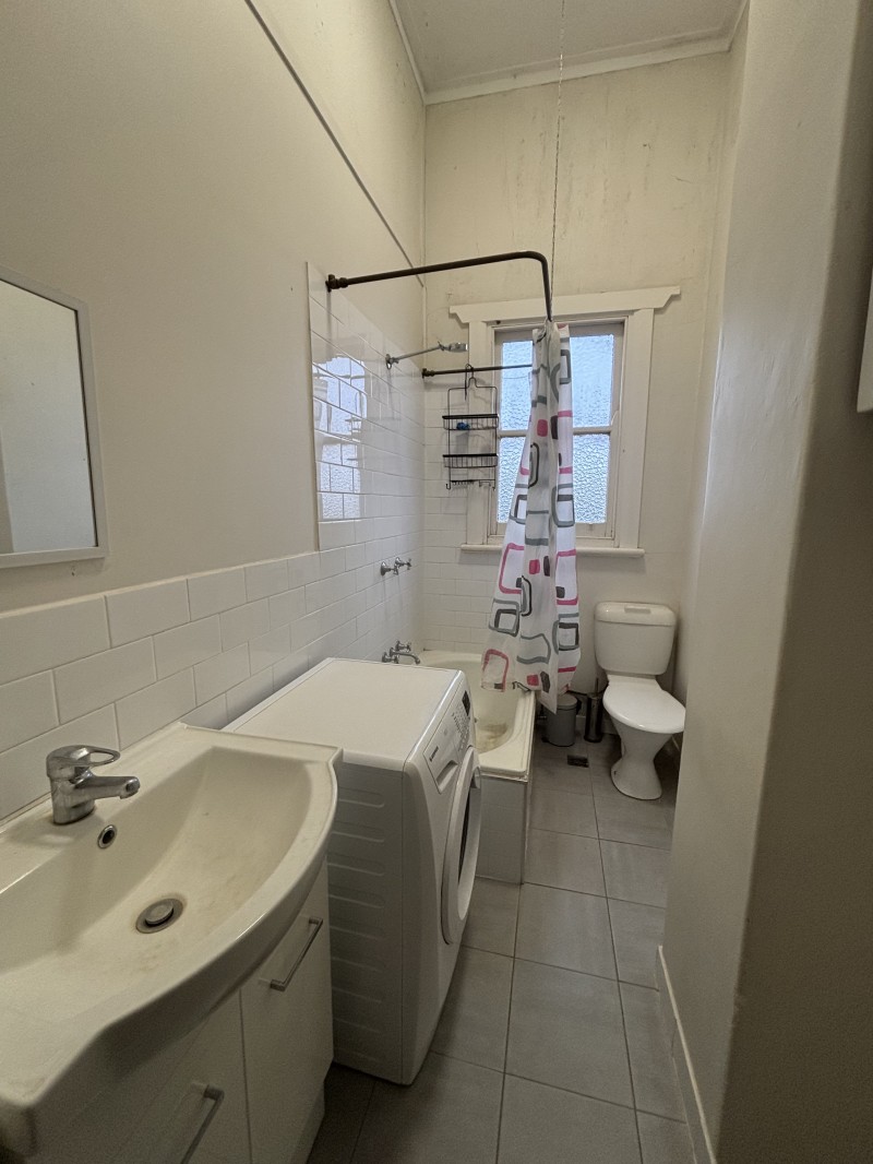 The bathroom includes a vanity, washing machine, toilet, and a shower over the bath.