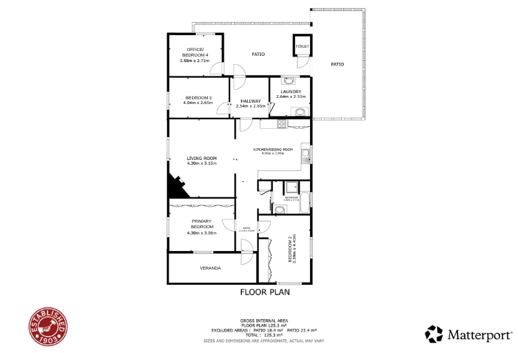 Comfort is assured year-round with a lounge room that includes a woodfire heater, ceiling fan, reverse cycle unit, and ducted evaporative air conditioning servicing the home. The original family bathroom includes both a bath and shower, while the toilet is located in the rear pergola/sunroom area, which also incorporates a versatile fourth bedroom, office, or storeroom.